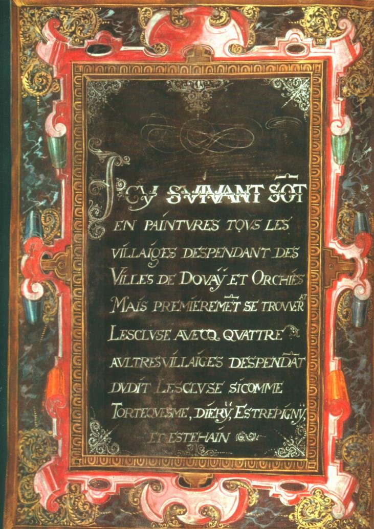 Villages de la Châtellenie de Douai & Orchies Page titre annonçant tous les villages dépendants des villes de Douay & d’Orchies dont en premier se trouvaient Lécluse, Tortequesne, Dury, Eterpigny et Etaing. |