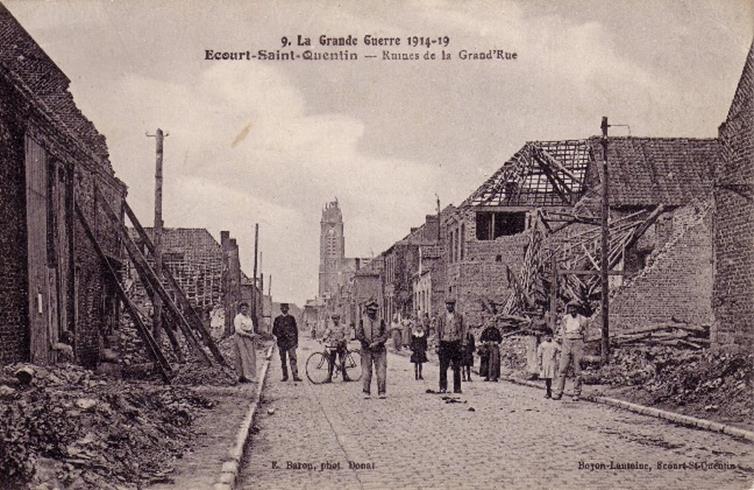 ECOURT Grand-rue ( avant d’être appelée rue Henri Barbusse) vers Eglise vue Nord 1918 (Clic sur Photo pour retour)