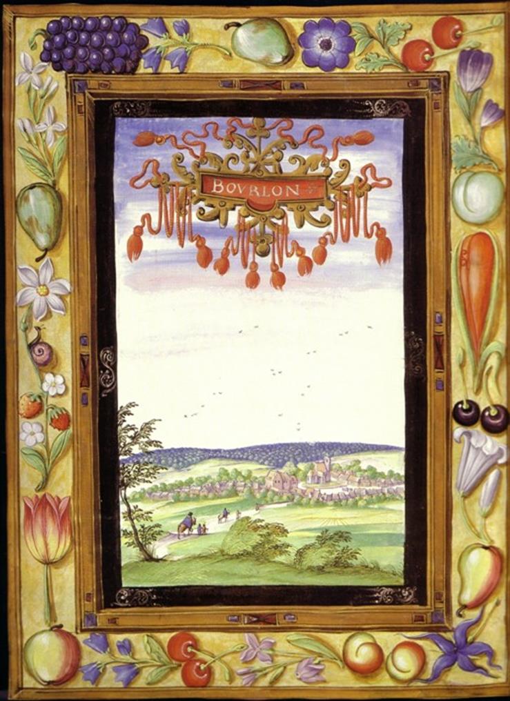Vue cavalière prise du Nord, semble-t-il, au niveau du lieu-dit La Croix Jean Coutant, d’où l’on peut voir le village dans son entièreté et une partie du bois de Bourlon en arrière. Le chemin pris par les voyageurs est celui qui vient de la route Cambrai-Arras, et qui part vers Anneux. On voit à droite une vaste place de village et sur un tertre enceint de murs, l'église paroissiale. Celle-ci est en pierre et toit de tuiles, nef courte et 2 transepts au niveau de la dernière travée. Le chœur est plus bas et plus étroit que la nef. Un clocher du type campenard à 2 étages surmonte la façade. A gauche de la place, un grand manoir de briques et couvert de tuiles avec trois corps de logis, lucarnes sous les toits et pignons à pas de moineaux |