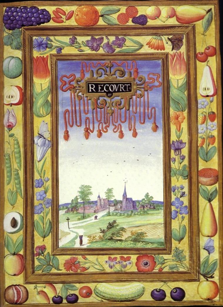 Vue cavalière du village prise du Sud. A gauche, à l’emplacement de l’actuelle chapelle de Notre-Dame de Grâce, une croix marquant la rencontre des 2 chemins. Celui du premier plan vient de Saudemont et fait un coude à droite comme aujourd’hui encore. Celui de gauche vient de Dury. Leur réunion forme l’artère principale du village qui, après l’église forme un coude à gauche comme actuellement. Le village est peu important. Il ne devait compter qu’une vingtaine de feux. Le peintre s’est plus orienté vers les édifices les plus marquants. A droite sur son tertre important s’élève l’église paroissiale en pierre et toits en ardoise. Le clocher est une tour à plan carré, avec contreforts, chambre de cloches comprenant des ouvertures doubles par côté, flèche de charpente. La nef est élevée dans laquelle sont entées 2 chapelles perpendiculaires à l’axe, comprenant chacune une ouverture au sommet. Le Chœur a 2 travées plus étroites et plus basses que la nef. Sur le côté gauche de la rue, face à l’église, figure le grand manoir des sires de Récourt. C’est un ensemble de bâtiments formant dans le mur d’enceinte, une grande cour. Toute la partie avant sert pour un usage agricole. Au-delà, un grand corps de logis à trois niveaux avec les fenêtres à meneaux. Les pignons sont à pas de moineaux. Contre ce corps de logis s’élève une tourelle en pierre de forme cylindrique avec toiture conique à lucarnes, en ardoise surmontée d’un étendard. |
