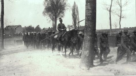 Des prisonniers anglais évacués en colonne et gardés par des Uhlans à cheval , sortent d’Ecourt par le Porkien en empruntant la route allant vers Oisy le Verger |